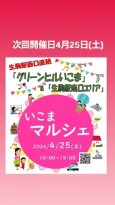 URLをコピーしました! イベント情報 よかったらシェアしてね! URLをコピーしました! いこまマルシェ 〜からだのプロに出会える〜 いこまマルシェ 第71回|4月25日(土)10:00〜15:00 グリーンヒルいこま この記事を書いた人 fukuharakazuhiro 関連記事 生駒市 ららら♪いこまマルシェ4月開催!グリーンヒルいこまに出店者集結 2026年4月13日 いこまマルシェ 第71回|4月25日(土)10:00〜15:00 グリーンヒルいこま 2026年4月11日